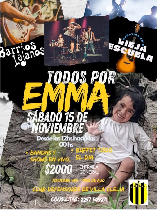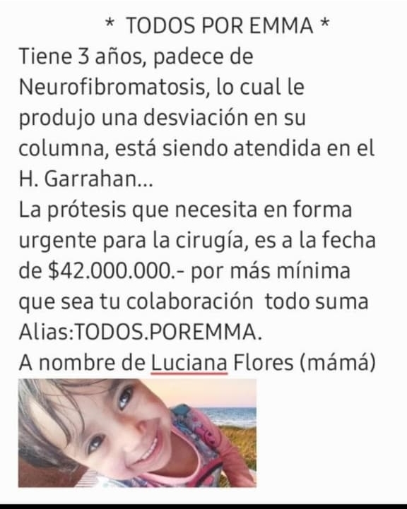 El Sábado 15 de Noviembre se realizara un evento cultural con el fin de juntar dinero para financiar la prótesis que Emma, de 3 añitos, necesita en su columna, la familia, los conocidos y amigos siguen buscando todo tipo de colaboración, por mas mínima que sea, vos podes sumarte a este acto dejando tu granito de arena al ALIAS: » TODOS.POREMMA. » a nombre de Luciana Flores, la mamá.